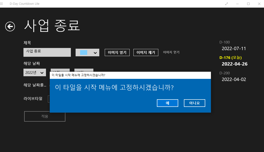 다시 생성한 디데이로 들어가서 라이브타일 옆에 새 라이브타일로 등록을 선택합니다